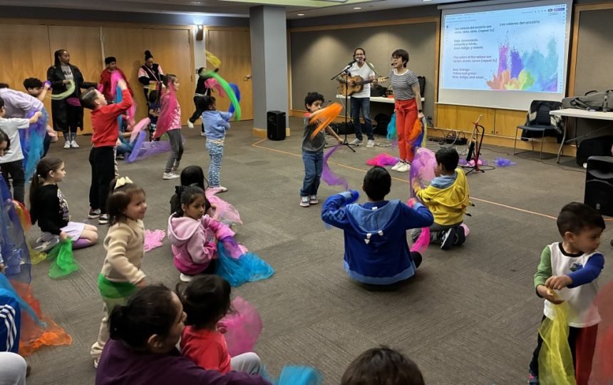 For the first 45 minutes of the celebration, the Alina Celeste Mi Amigo Hamlet duo entertained the youngsters. She led them in a variety of dances with the music mostly in Spanish, but also in English. The youngsters used arm motions and the props she gave them. The dual language component is important.