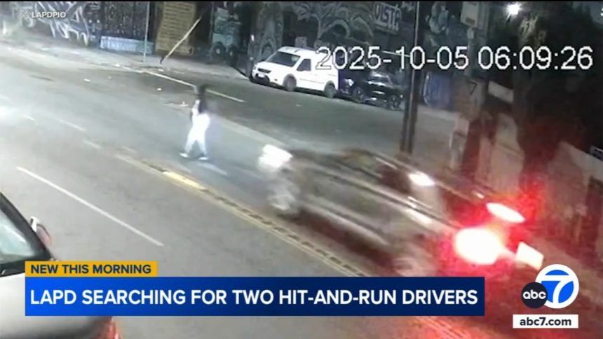 DOWNTOWN LOS ANGELES (KABC) — Los Angeles police are searching for two hit-and-run drivers who critically injured the same woman in downtown.